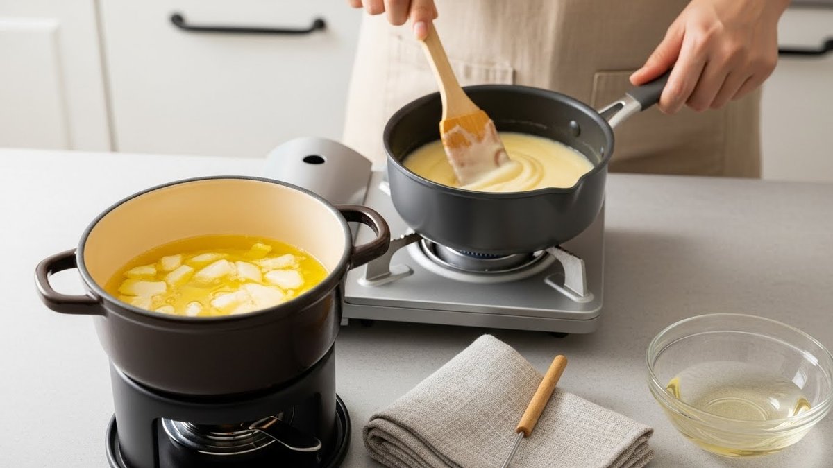 器具は厚手の鍋やフォンデュ用の容器を使うと温度変化が穏やかになり、分離しにくくなります。火力は初めは中火で温め、チーズを入れてからは弱火に落とすのが基本です。