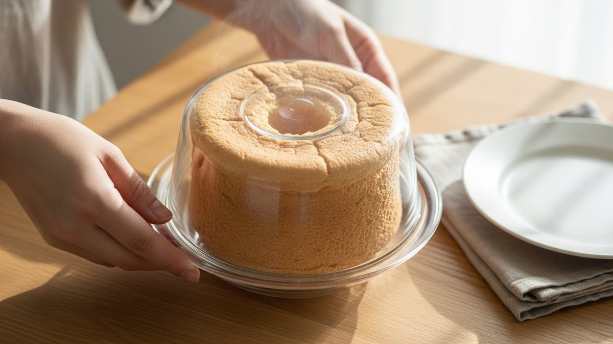 シフォンケーキを逆さにするのは、重力で生地が潰れるのを防ぐためです。焼き上がった生地は中心が沈みやすく、逆さにすることで自身の重さで型に張り付き、ふんわりした高さを保ちます。瓶がなくても同じ効果を得られる方法がいくつかあります。