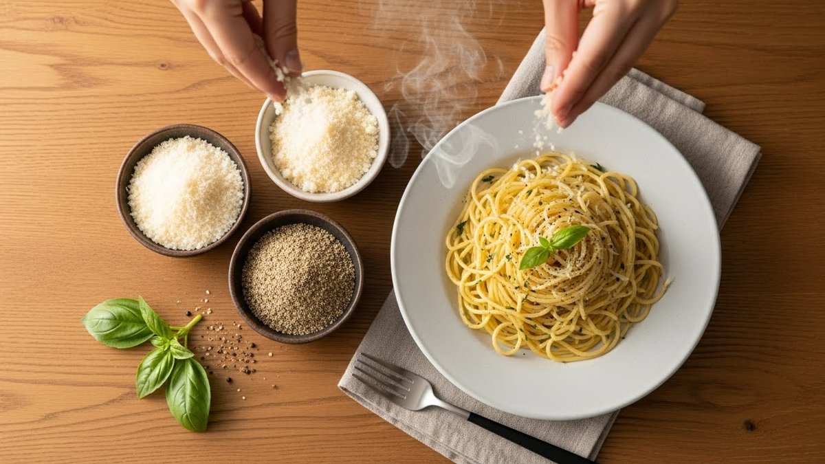 黒胡椒は挽きたてを少量振るだけで香りが立ち、特にパルミジャーノやペコリーノと好相性です。オリーブオイルは酸化しにくい良質なものを仕上げに回しかけると香りが全体にまとまります。レモン果汁は凝縮したクリーム系やシーフード系の重さを軽くし、チーズの塩味を引き立てます。